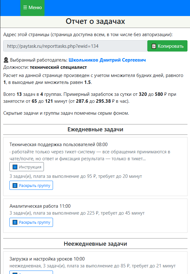 Сервис paytask это менеджер задач, предназначенный для работников и работодателей, который ориентирован на учёт повторяющихся изо дня в день задач ваших бизнес процессов. За каждую задачу можно назначить плату и тем самым вести учёт сдельной зарплаты (отчёт о зарплате). В этом сервисе у вас может быть множество работников и работодателей с разными должностями и работодатель может поделиться списком задач с подробными инструкциями с потенциальными работниками (отчет о задачах).